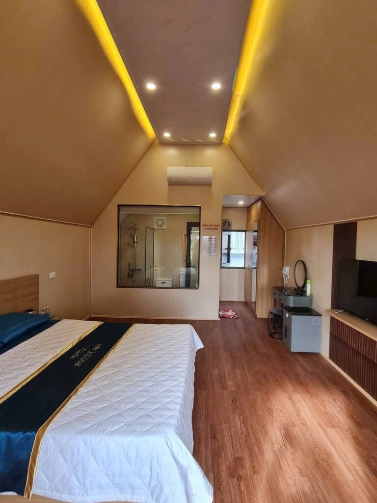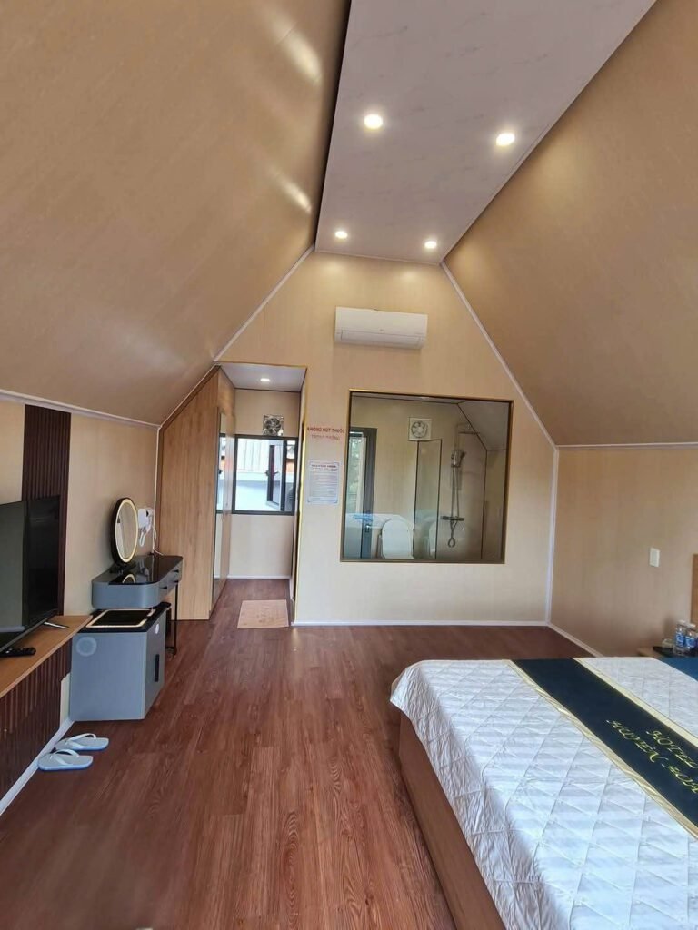 Vách kính ngăn khu vực tắm, thông với không gian phòng ngủ qua ô kính lớn